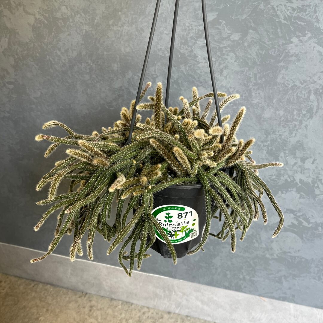 リプサリス"ビロカルパ"は、トゲがなく垂れるように育つ多肉植物です。