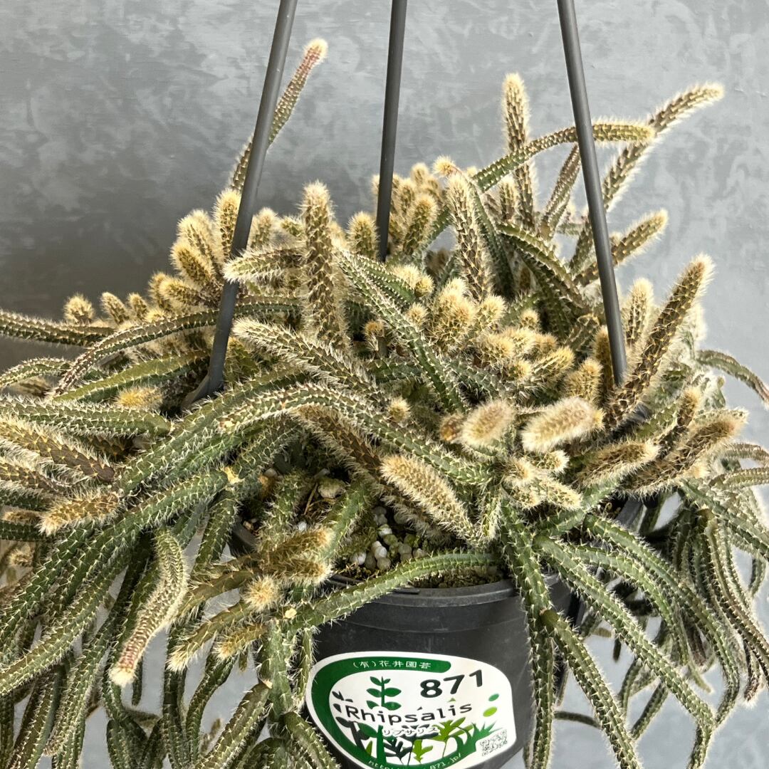 サボテンの仲間で、細長い茎が下に垂れ下がるように育つ様子が、リラックスした雰囲気を演出します。室内のインテリアとしても、素敵なアクセントになります!