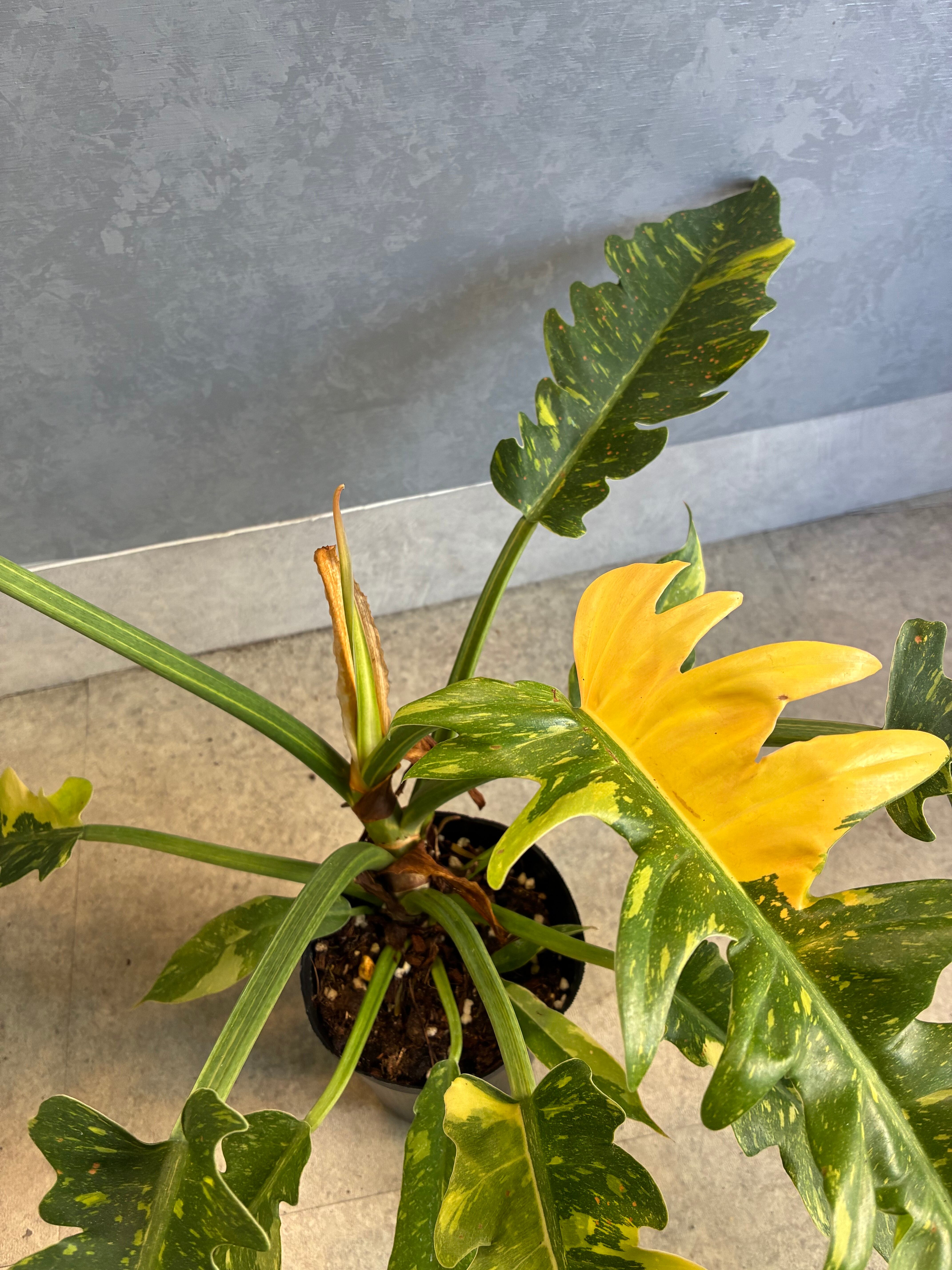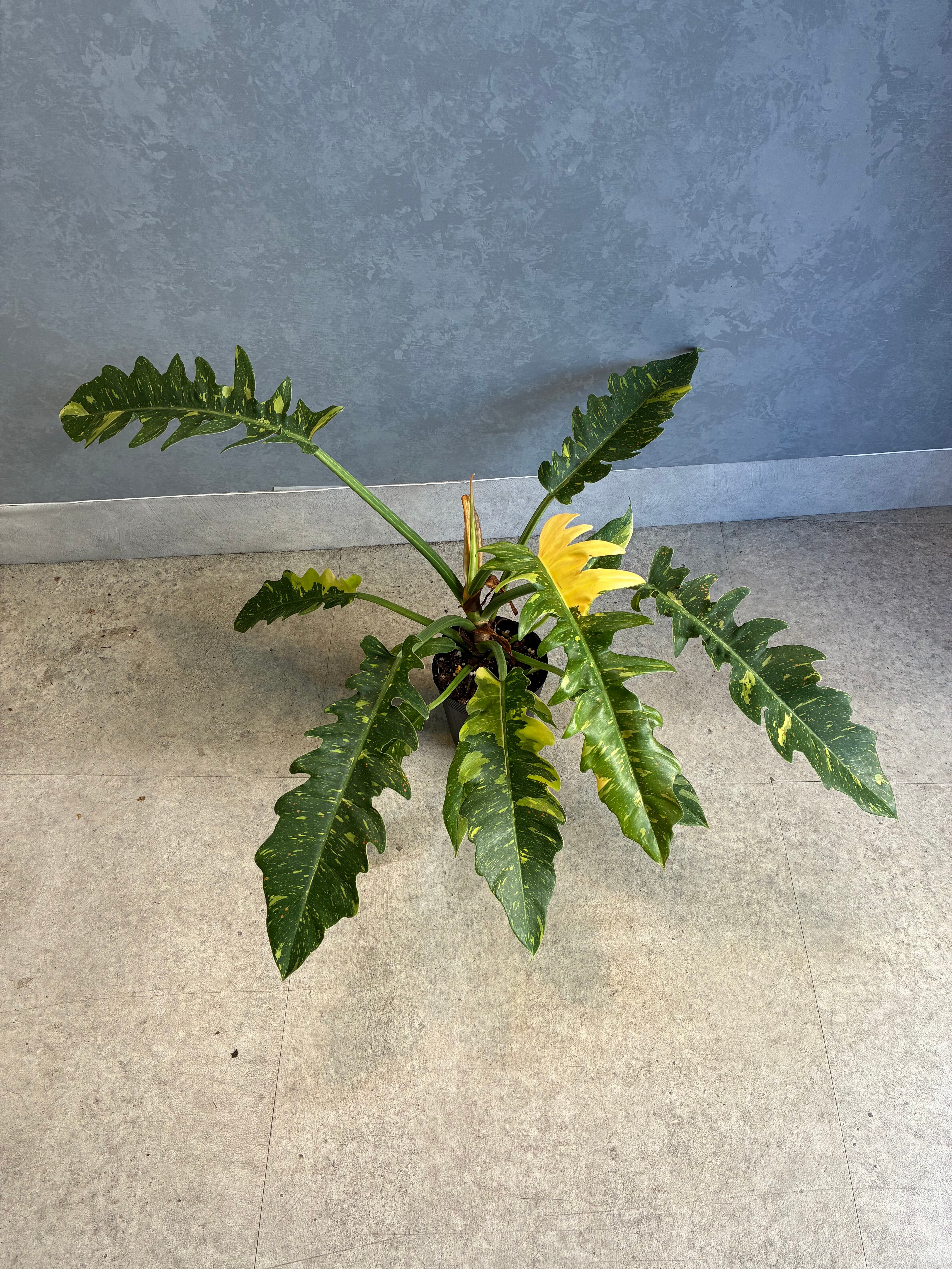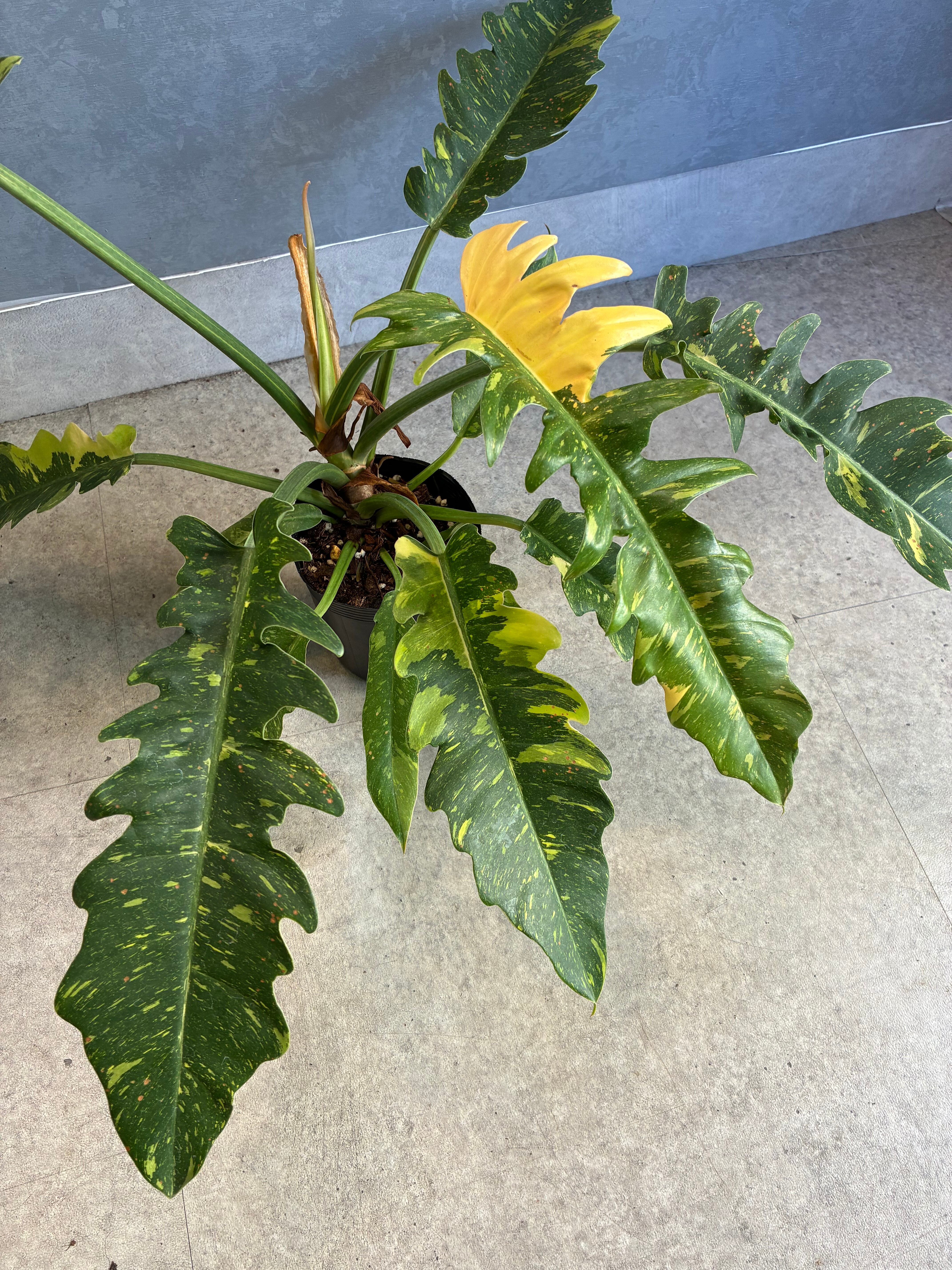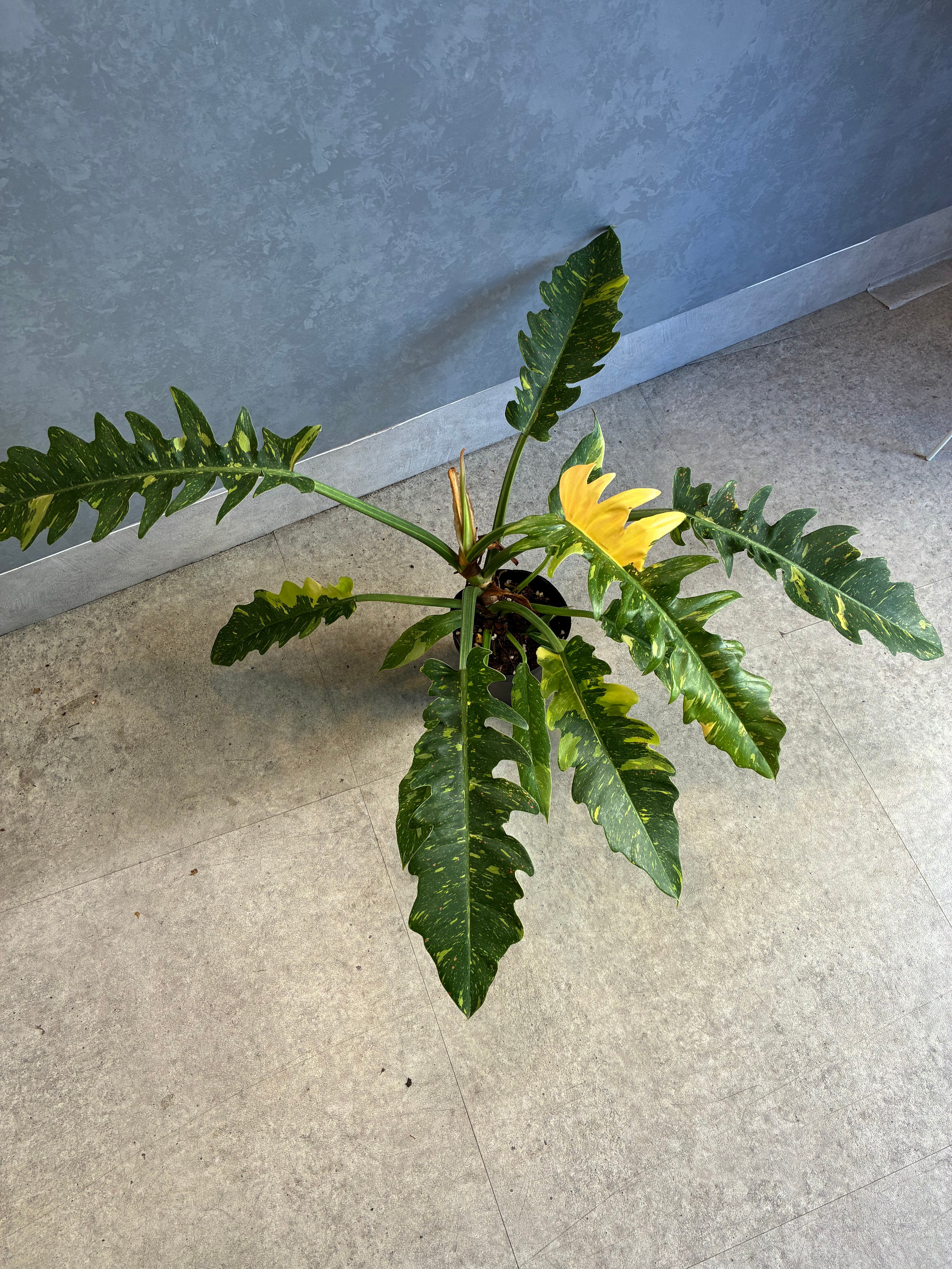 フィロデンドロンリングオブファイヤは、黄色から白色の散斑のギザギザ切れ込みの入った葉がスタイリッシュなフィロデンドロンです。大きくつやのあるグリーンの葉を広げるサトイモ科の観葉植物です。育て方も比較的簡単なので、初心者の方にもお勧めです!