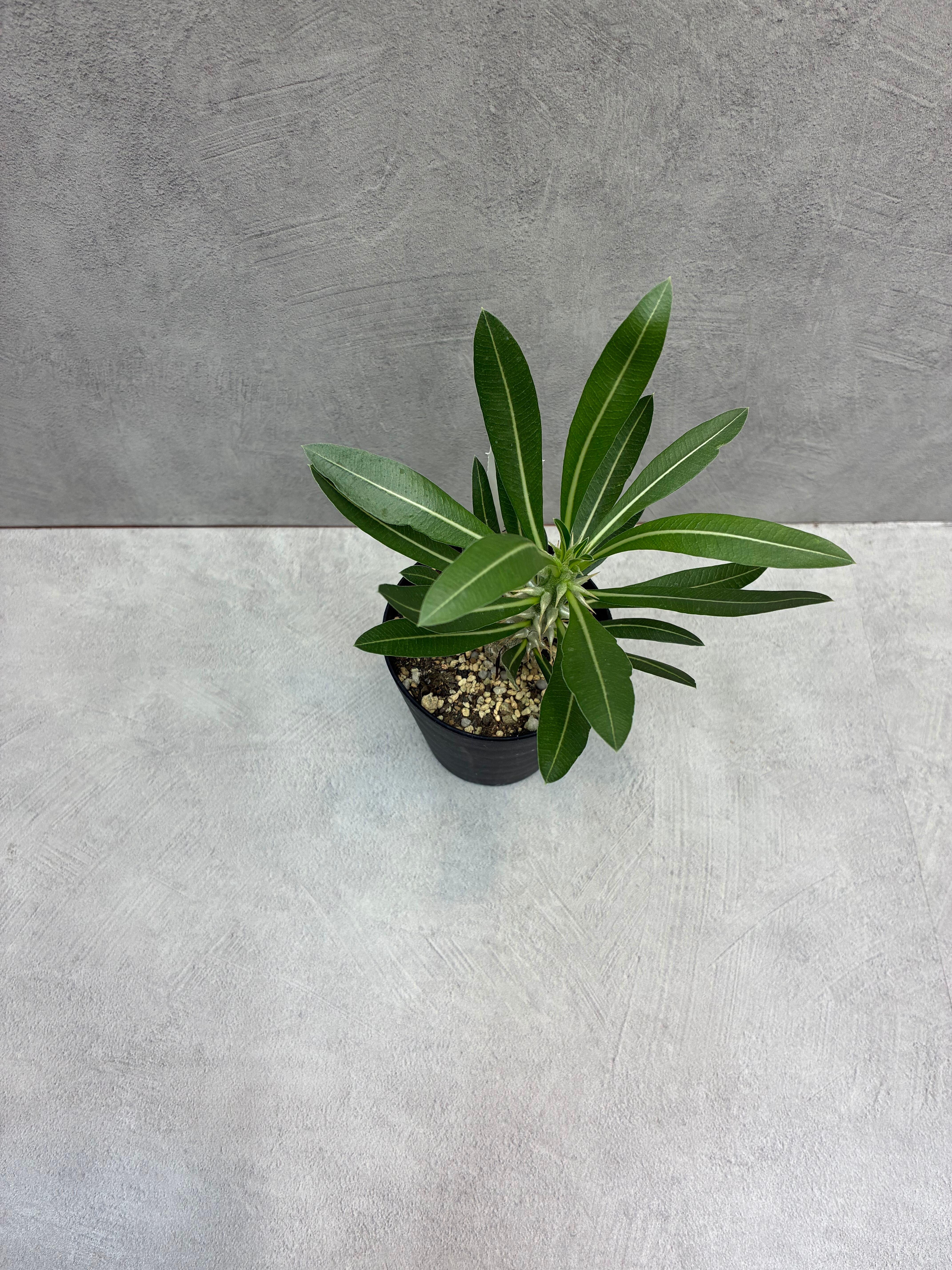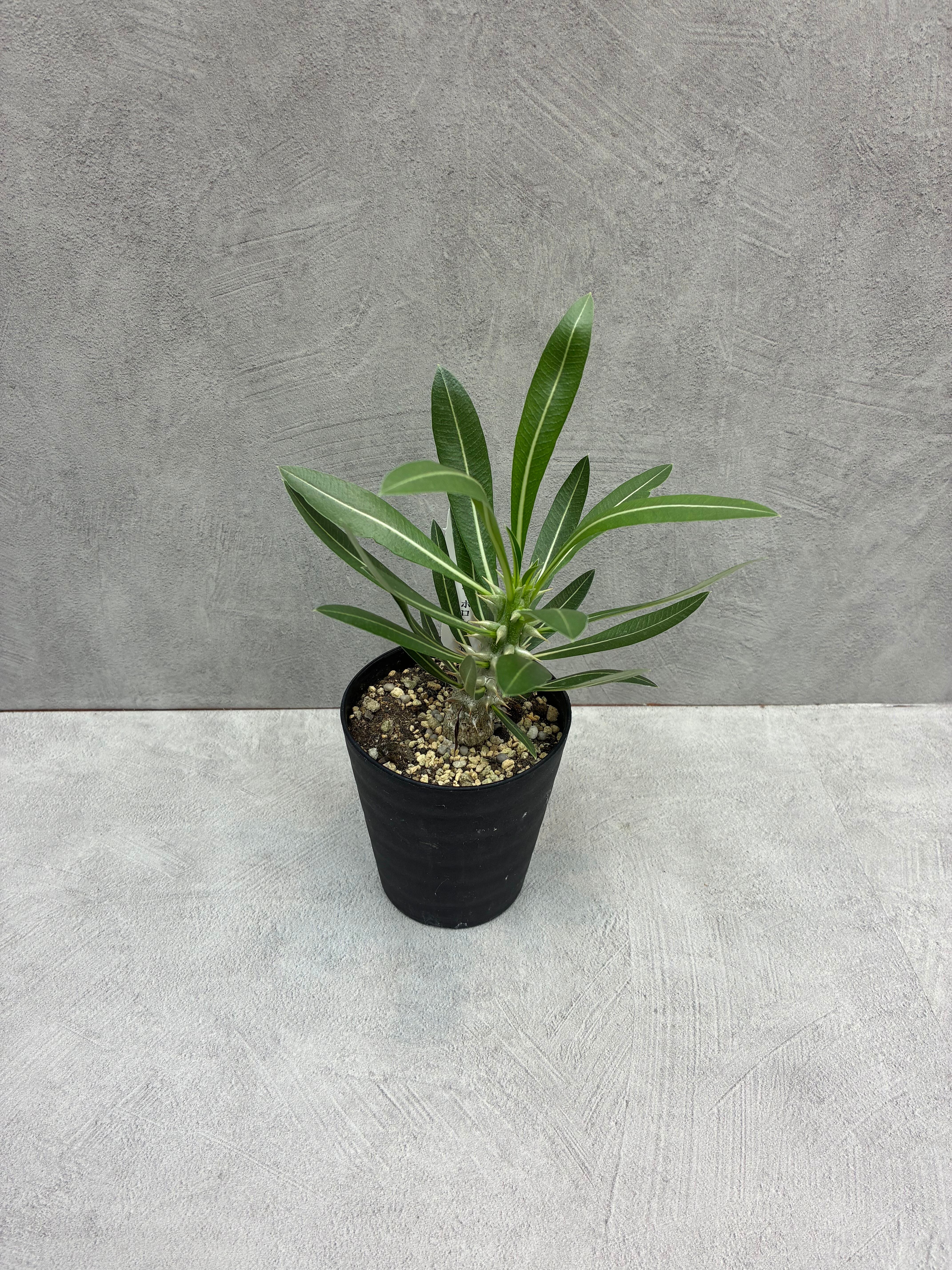 「パキポディウムホロンベンセ」は、基部がまるまると太ったものや、ずんぐりとした棒状の幹をもつものなど、独特のフォルムが人気の植物です。